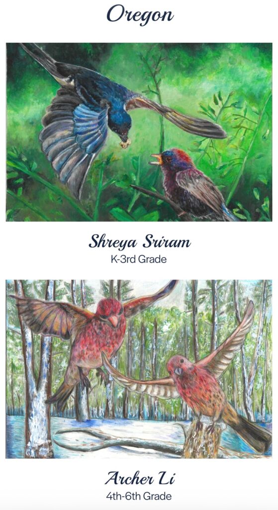 On February 9, 2026, Wildlife Forever announced the winners of the 2025 Songbird Art Contest. Once again, several Art World School students earned top placements. They created their winning entries during Art World School art classes. Shreya Sriram won first place in the K–3rd grade category. Charlotte Kuo won second place in the K–3rd grade category. Archer Li won first place in the 4–6th grade category. Melisa Aslan won second place in the 4–6th grade category.