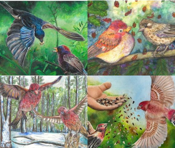 More than 3,500 students from 36 countries and 43 U.S. states submitted artwork for the 2025 Songbird Art Contest. This made 2025 the largest year of participation in the contest’s history. Students chose one of five bird species: Black-and-White Warbler, Pinyon Jay, Purple Finch, Varied Bunting, or White-breasted Nuthatch. Each student submitted an original artwork in a fine art medium of their choice. They also wrote a piece inspired by their selected bird.
